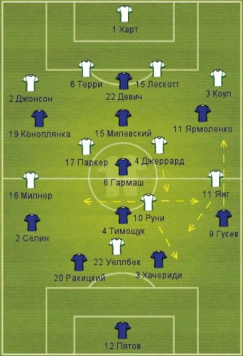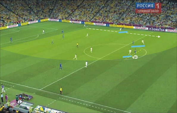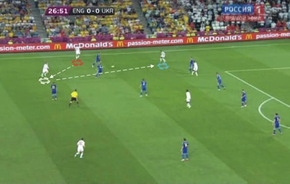 Момент с предшествующем незасчитанному голу пасом. Артём Милевский (белый) находится от мяча едва ли не дальше всех футболистов на поле, за исключением Гусева и сторожащего его Коула (на переднем плане). Каким образом мяч достанется Милевскому – загадка. Ответ на неё кроется в том, что каждый из защитников англичан продолжал опеку своего игрока (указано синим), не бросался на перехват мяча: Джонсон – Коноплянку, которому вероятно и предназначался первоначально мяч, а Терри – Девича.