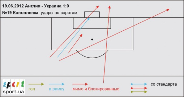 После 20–й минуты, используя пассивность англичан в атаке, Гусев стал подключаться вперед, и завершил своё присутствие ударом издали. Дальние удары в исполнении ранее Гармаша, а чаще Коноплянки, продолжались использоваться украинской командой, правда, как и в предыдущем матче – крайне мало-результативно (см. диаграмму ниже).