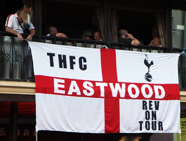 Уже традиционно англичане засели в пабе на Рогнединской. Удобно: сами на виду, болельщики соперников, которым можно поорать что-нибудь обидное, гуляют рядом, до стадиона рукой подать.