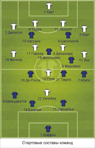 В своих дебютных атаках сборная Италии действовала преимущественно длинными забросами на Балотелли со стороны Пирло и центральных защитников, которые, как правило, не доходили до адресата. В результате к 15–й минуте матча Англия вела в острых моментах и ударах по воротам со счётом 3:1.