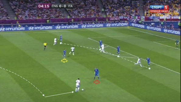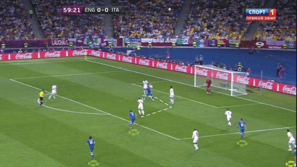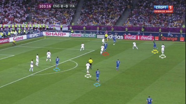 Джонсон (с мячом) получил диагональную передачу из глубины от Джеррарда и поддерживает участвующее в полном составе нападение команды в атаке. С другой стороны линии защитников Италии в обороне помогают лишь Де Росси (красный) и Пирло (желтый). Численное соотношение для такой атаки средним темпом весьма неплохое для англичан, и она в итоге закончится весьма острым моментом Джонсона.