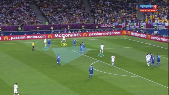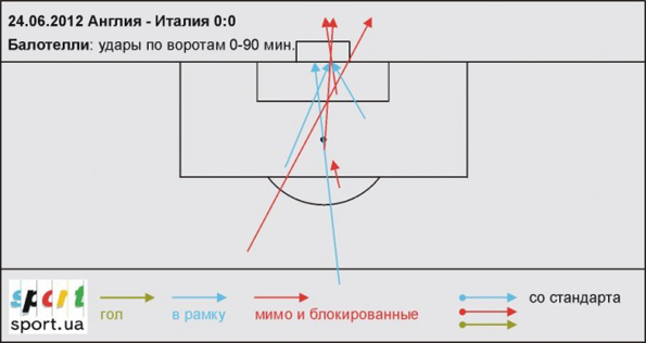 Абате (желтый в углу) подал в зону, за мяч в окружении 4–х защитников Англии борется один Балотелли. Он не имеет вариантов поддержки – его партнёры Кассано, Монтоливо и Маркизио (зелёные) находятся вдалеке и прикрыты другими защитниками, на дальнем фланге также ни одного игрока сборной Италии. В результате Балотелли ничего не остаётся, как попытаться выиграть верховой мяч и нанести удар самому. Он это сделает эффектно в прыжке через себя, получая, в результате, очередную порцию упрёков в эгоизме.