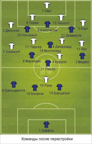 Перестройка команд во втором тайме добавила агрессии Италии, которая обрела новые силы для организации давления. При этом Балотелли сохранил свою роль, но атакой также были заняты вышедшие на замену игроки защиты и полузащиты. Кроме того, момент с не засчитанным голом организовали вышедшие Диаманти и Ночерино, один из которых подал, а второй забил. С другой стороны, вышедшие нападающие Кэролл и Уолкотт были заняты защитой и поучаствовали лишь в двух атаках, где не нанесли на двоих ни одного (!) удара по воротам. В условиях выбранной оборонной тактики, их индивидуальные возможности как нападающих абсолютно нивелировались, Кэролл ещё раз показал себя, как нападающий сугубо для штрафной площадки, а скоростные качества Уолкотта не были использованы по причине отсутствия у него мяча.