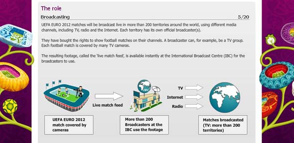 E-learning - процедура доволі цікава. Насправді, це звичайнісінькі собі тести в електронному вигляді. Спочатку ти вивчаєш певну інформацію про УЕФА, історію чемпіонатів Європи, Євро-2012, країни учасниці та господарки турніру – тобто загальні відомості, що допомагають краще розумітися на тому, з чим матимеш справу. Інформація подана компактно - у схемах, таблицях, з великою кількістю фото, демонструючого матеріалу і усіляких цікавинок. Далі нескладні тести, по щойно пройденому та врешті перехід до головного – профільне навчання. Так само в електронному вигляді розповідь про Бродкаст сервіс, координаторів, зобов’язання та обіцянки детальної інформації на спеціальних тренінгах.