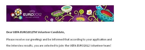 Доволі довго. Настільки, що вже починаю сумніватися, а чи взагалі шановні розгядачі анкет з УЕФА натрапили на мою, номер якої вже перевалив за шосту тисячу. Більш ніж за місяць чекання отримую відповідь – натрапили, та ще й запросили на співбесіду. Відбувалася вона в день офіційного відкриття НСК «Олімпійський». Той самий, коли я відверто чекала на Шакіру, а мене змусили ще й похвилюватися. Виявилося, що особливого приводу для хвилювання не було. Головна вимога для волонтера, незважаючи на обраний профіль – вільна розмовна англійська мова. Звісно, довелося ще себе добре похвалити, знову кілька разів повторити, для чого мені безкоштовно працювати на УЕФА, отримати подарунки та … знову чекати на підтвердження. 6 осіб на місце – це вже як конкурс на доволі престижну посаду.