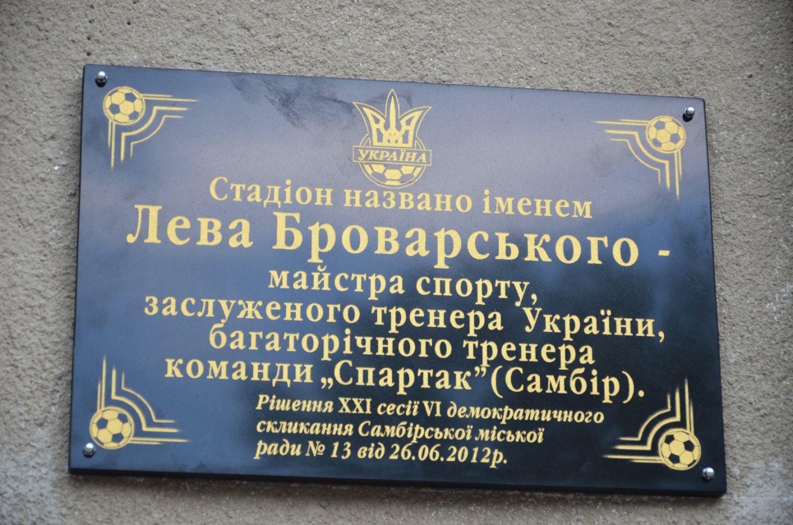 Трохи раніше на сесії Самбірської міської ради було прийнято рішення про присвоєння міському стадіону імені Лева Броварського. Цим самим депутати виконали волю групи шанувальників його спортивного таланту. Майстер спорту, володар Кубка СРСР після розставання з великим футболом та львівськими «Карпатами», за які провів 12 сезонів, сім років поспіль був граючим тренером тодішнього самбірського «Спартака». Стільки часу під його керівництвом команда була незмінним лідером обласної першості та багаторазовим володарем кубка.