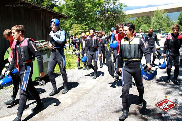 И вот настал вторник, и в 10:20 утра по местному времени автобус со спартаковцами отправился в местечко Эц, где находится рафтинг-клуб Wasser-c-raft. Прибыв на место, спартаковцы облачились в специальные гидрокостюмы, спасательные жилеты и шлемы. Переодеваясь, футболисты не скрывали улыбок: им было непривычно видеть друг друга в резиновых гидрокостюмах, покрывающих тело с ног до головы. Особенно повеселил народ Эммануэль Эменике, поначалу надевший шлем, который был ему мал на несколько размеров.
