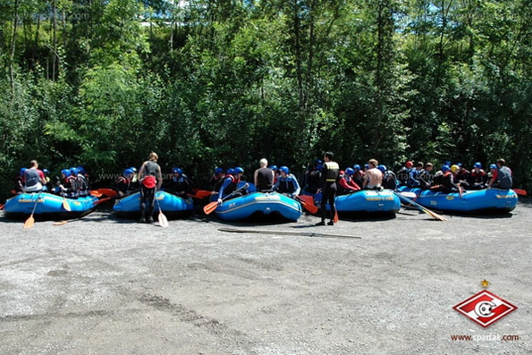 Затем футболисты и тренеры «Спартака» на автобусе отправились непосредственно к месту спуска плотов на воду. Бурная горная река, хоть и не высшей по рафтинговой шкале категории сложности, все равно таит в себе определенные опасности. Поэтому перед сплавом красно-белые прошли десятиминутный инструктаж.