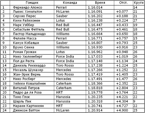 Лидер чемпионата Фернандо Алонсо показал лучшее время в заключительной части свободных заездов Гран При Германии, опередив на 0.077 сек. Льюиса Хэмильтона. Третий результат показал пилот Sauber Серхио Перес. Кими Райкконен и Марк Уэббер замкнули первую пятерку. Протокол замкнул Дженсон Баттон, не проехавший ни одного круга в квалификационном режиме.