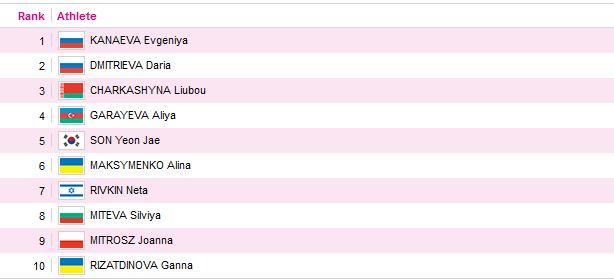 Первой в истории двукратной олимпийской чемпионкой по художественной гимнастике в личном первенстве стала Евгения Канаева. На втором месте - Дарья Дмитриева (Россия), на третьем - Любовь Черкашина (Беларусь).