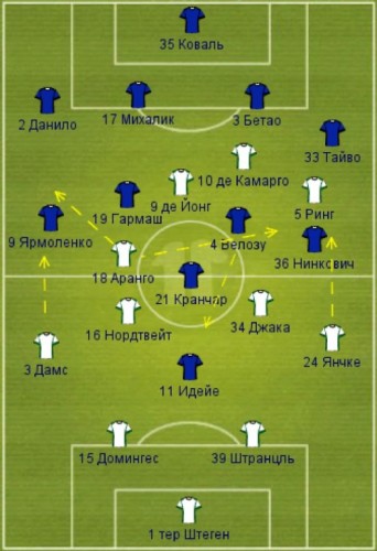 Дамса (с мячом) вновь встречает Ярмоленко (желтый), тут же Нинкович, пришедший с другого фланга за своим подопечным вслед за развитием эпизода. Велозу и Кранчар контролируют центр и подбор, линия защитников - лишь резервный вариант.
