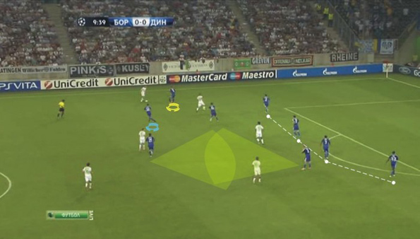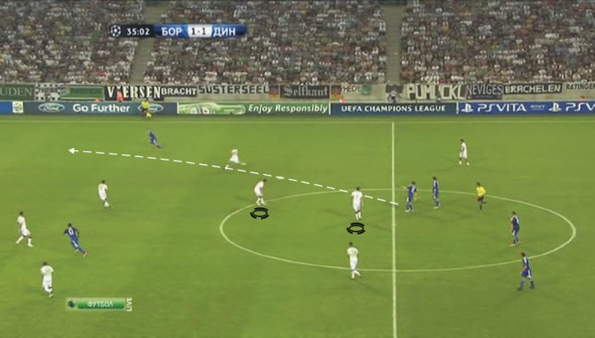 Кроме того, преимущество «Боруссии» в стартовом давлении было обусловлено активным подключением вперёд фланговых защитников Дамса и Янчке. Это обусловило впечатление сравнительного территориального преимущества команды хозяев. Со стороны «Динамо» в таких действиях был заметен лишь Тайво, и то начиная примерно со второй четверти игры. К тому же при подключении к атакам нигериец допускал значительное количество брака, причём в ситуациях, когда он стремился выступить в роли плеймейкера, например отдать обостряющий пас. Очевидно, что Юрий Сёмин не видит левого фулбека в этой роли, и впоследствии данная несогласованность должна быть устранена.