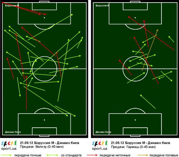 Вследствие особой роли Гармаша и Велозу, как в этом матче, так и в построении игры «Динамо» в будущем, любопытным представляется сравнение объёма и характера выполненных обоими полузащитниками передач, представленное на диаграмме: