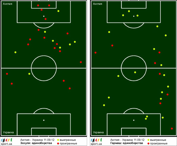 В свете кадровых изменений в составе украинской команды особый интерес вызывала оценка действий на своих позициях Зозули и Гармаша. Диаграмма выше отображает их эффективность в единоборствах. Кроме бросающегося в глаза общего баланса удачных действий у Гармаша, особо следует отметить результативность борьбы обоих в штрафной соперника и на подходах к ней.