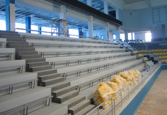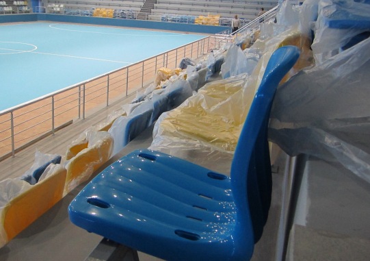 Что касается спортивной площадки, то основное покрытие уже уложено – его осталось разметить и нанести защитный слой. Кроме того, начался процесс установки пластиковых сидений. Электронное табло, находящееся под прикрытием плотной пленки, уже смонтировано.