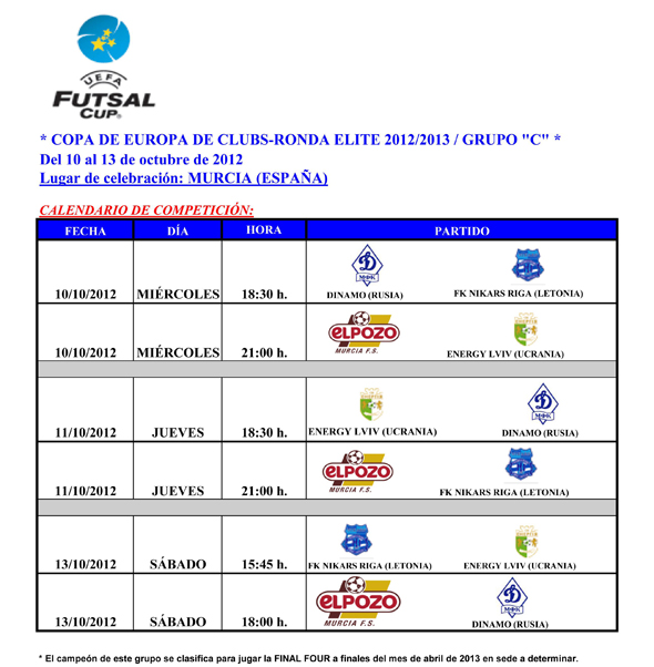 Стали известны даты игр элитного раунда в группе С, в которой играют МФК «Динамо» (Москва), рижский «Никарс», «Энергия» (Львов) и хозяин мини-турнира, испанский «Эль Посо». По итогам матчей элитного раунда победители квартетов попадут в «Финал четырех», который состоится в апреле 2013 года.