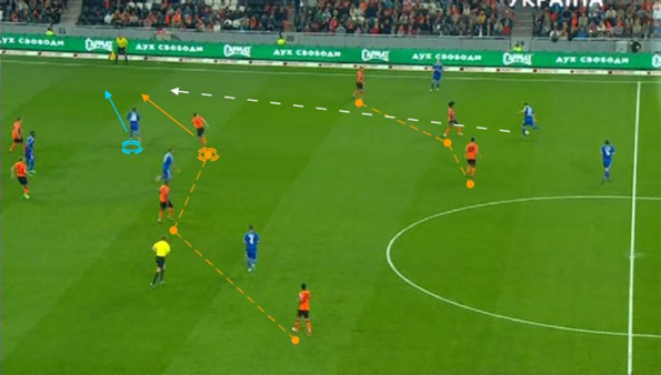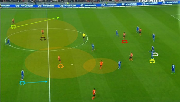 Гости действуют в обороне излишне сжато, игроки соперника имеют массу пространства. Фернандиньо (оранжевый принимает мяч) имеет несколько вариантов продолжения атак: разрезающую передачу на забегающего Виллиана (красный) либо доставку мяча на левый фланг, где подключается Шевчук (зеленый). Очевидно на это Вукоевичу (белый) указывает Бетао (желтый). Ярмоленко (синий) опаздывает в оборону.