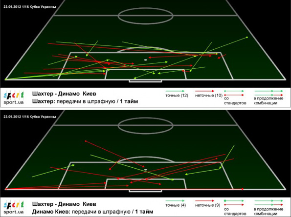 Среди заметных отличий следует выделить, что на сегодня завершающей фазе атак «Шахтера» верховая передача в расчете на борьбу в штрафной практически отсутствует как вид. В условиях отсутствия Чигринского и ушедшего Селезнева в команде осталось не так много игроков, отдающих предпочтение верховой игре. Исключения составляли диагональные кроссы для перевода мяча на противоположный фланг, «на ход» полузащитнику или в зону инсайда, а также пара подач Шевчука. В штрафную же мяч чаще всего доставлялся низом, после глубоких фланговых охватов. Любопытно, что при этом адресат поперечной передачи в штрафную зачастую находился дальше от ворот, нежели выполнявший прострел игрок.