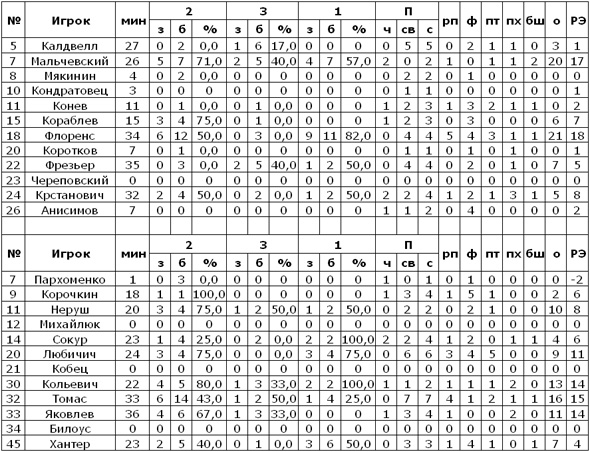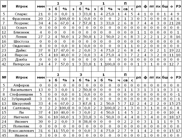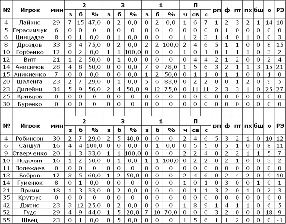 Единственной командой, которая одержала сегодня победу на выезде, стал коллектив «Черкасские мавпы», не без труда обыгравший «Кривбассбаскет». В составе хозяев паркета следует отметить Флоренса и Мальчевского, которые на двоих набрали более сорока очков. Как оказалось, столь внушительных показателей двух игроков в составе команды Муйжниекса было недостаточно. Криворожцам удалось отыграть отставание в пять очков после большого перерыва и сравнять счет, но результативная игра Неруша и Любичича вновь вывела вперед «мавп», завершив третью десятиминутку со счетом 45:51. Решающий игровой отрезок Кораблев и Флоренс начали активно и после реализованного «эндуана» лидером «Кривбассбаскета», хозяева паркета минимально вырвались вперед – 52:51. В следующей же атаке Томас точно пальнул из-за дуги, а спустя две минуты 6 баллов от Кольевича расставили все точки над «i». Гости довели разницу в счете до +10, уверенно завершив встречу победой.