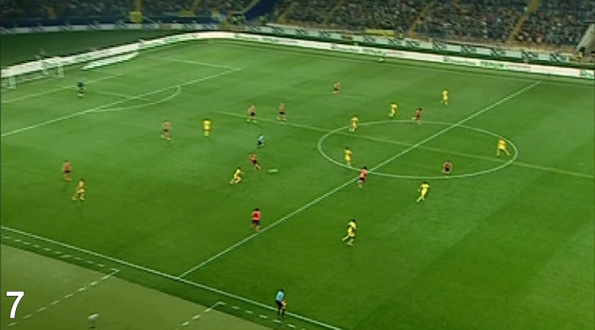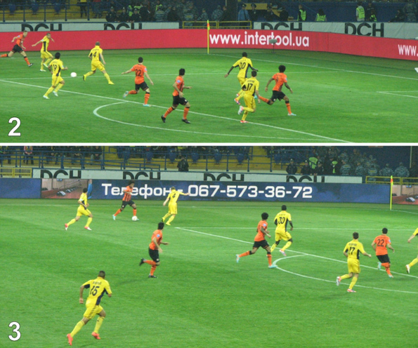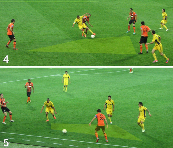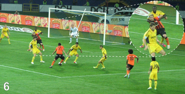 Атаки «Шахтера» несколькими минутами позже. В обоих случаях Мхитарян (№22) – активнейший участник эпизодов: просит мяч (2), или же расположен выше всех в атаке (3). Защитникам «Металлиста» помогают обороняться и Хавьер, и Торрес, и даже опаздывающий Фининьо, но не Соса.