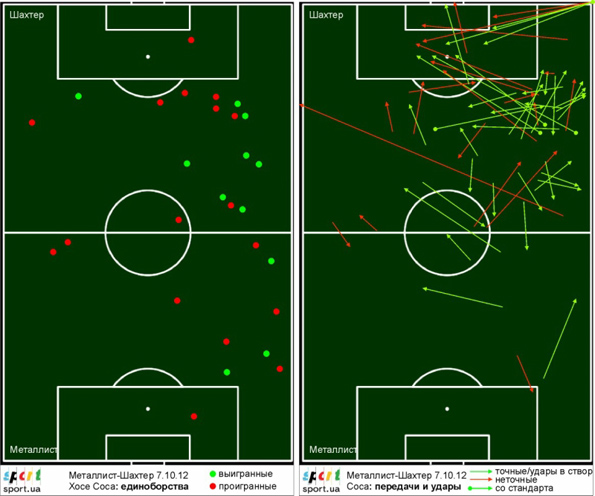 То же самое можно сказать и об успехе например единоборств (см. диаграммы ниже). За весь матч, играющий атакующего полузащитника Соса, отдал всего одну (неточную) передачу в штрафную с игры. Также можно вспомнить о том, что комбинация «Шахтера», завершившаяся голом Илсиньо, началась с проигранного Сосой единоборства головой, где он всегда был ранее силен.