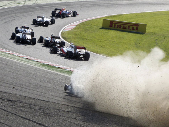 З одного боку Кімі проколов задню ліву шину на Ferrari своїм переднім крилом і це може здатися достатнім для висновків про винного, але висновків передчасних. Справа в тому що Алонсо від самого старту гонки рухався спочатку по діагоналі ліворуч і коли його червоний болід порівнявся з чорно-золотою машиною фіна Фернандо продовжував потрохи вирулювати назовні. Це призвело до того, що Кімі лівими колесами змушений був з’їхати на траву, але ноги з газу не зняв, продовжуючи рух прямолінійно – невже Алонсо сподівався налякати пілота з прізвиськом Iceman? Ще під час гонки іспанець сказав, що Ряйкконен перед входом в поворот мав поступитися місцем, бо для трьох машин (праворуч від Фернандо і майже впритул їхав Баттон) місця елементарно не вистачало. Але виникає питання чи насправді Кімі після того як його досить безцеремонно змусили проїхатися травичкою був щось винен лідеру чемпіонату? Радше Фернандо мав думати про те, що потенційна і дуже очікувана перемога Феттеля наблизить німця в особистому заліку, а отже 29 очок переваги треба компенсовувати протягом гонки. Зрештою відому фразу Шумахера про те, що «гонки в першому повороті не виграються» можна перенести і на Алонсо – відіграти максимальну кількість позицій на старті хоч і можна, але інколи варто відступити, щоб у підсумку здобути більше… Ще один штрих до цієї аварії стосується того, що коли регламентом ще з 2009-го збільшували ширину переднього крила болідів з одночасним звуженням заднього, абсолютно очевидним наслідком такого рішення було більш ніж імовірне збільшення саме таких аварій з проколотими шинами та зламаними крилами.