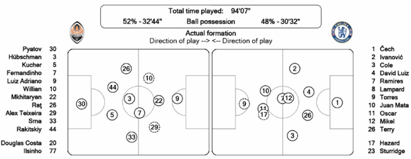 И вот с этой командой пришлось играть вчера «Шахтеру», эту команду дончане смоли победить на «Донбасс Арене», заполненной болельщиками, а также по аналогии с Евро – многочисленными гостями из России, среди которых, как известно, много болельщиков «Челси». Рассмотрим тактические детали этого противостояния.