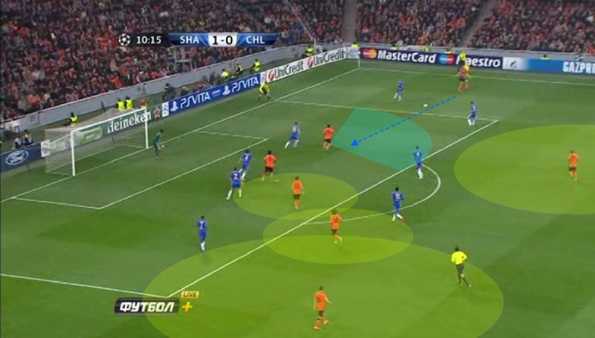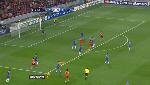 Прорехи организации зонной обороны «Челси» в две линии выглядят просто вызывающими. Большинство игроков «Шахтера» в данный момент обладают оперативной свободой, Тейшейра имеет перед собой свободный сектор для приема мяча (синий) от Срны, который также делает передачу совершенно беспрепятственно. В таких условиях говорить, что ранее мяч был без проблем доставлен хорвату уже излишне.