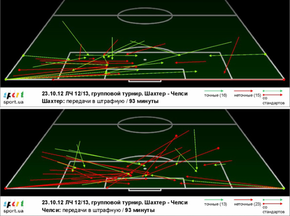 Отдельно следует прокомментировать и то, как мяч вообще попал к Адриано (точка его получения и дальнейшее движение в борьбе с Луисом выделено оранжевым). Он был попросту вброшен в штрафную Рацем при подаче аута! В результате имеем среди виновников гола всех защитников «Челси», находившихся поблизости, а также констатируем великолепное умение игроков «Шахтера» открываться для приема мяча.