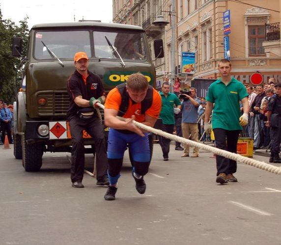Первым упражнением стала тяга бензовоза весом 9 тонн на расстояние 20 метров на время. После жеребьевки первым вышел восемнадцатилетний Михаил Мельников. Кстати, Михаил продолжает семейные спортивные традиции. Его отец, Николай Мельников, чемпион мира в командном первенстве по "Богатырским Играм", рекордсмен Книги рекордов Гиннесса. Парень поддерживал себя громкими выкриками. Как объяснил после упражнения Михаил, первому тяжелее всего сдвинуть машину с места: «На протяжении нескольких последних турниров жеребьевка упорно указывала на то, что именно я первым должен сдвинуть несколькотонную машину», -- сказал Миша. Первый участник показал 29,35 сек.