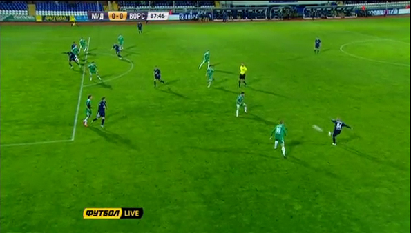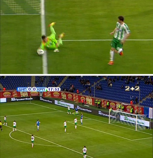 На рисунке хорошо видно, что мяч поле не покинул. Козык, находящийся за пределами штрафной площадки, принимает другое решение. Вообще можно отметить это уже как тенденцию – в ситуации мяча на линии украинский арбитр скорее свистнет «аут», нежели продолжит игру. И это в то время, когда правила говорят об обратном – мяч должен пересечь линию полностью. В данном и массе других случаев со стороны арбитров определенно присутствует желание «перестраховаться», что явно нарушает темп игры.