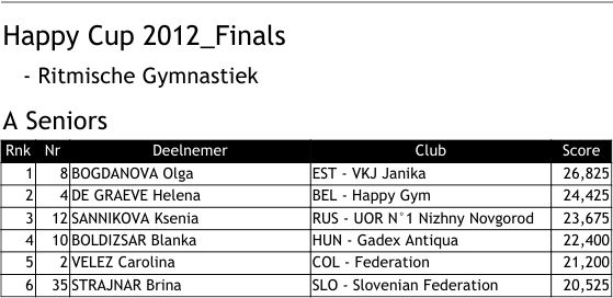 На прошедших выходных в Бельгии состоялся 15-й международный турнир Happy Cup 2012. Соревнования собрали обширную географию участниц, среди которых — гимнастки украинских СК «Гармония — Элит» из Киева и львовской «Ники».