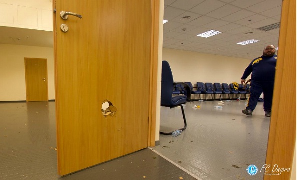 Картину ущерба, нанесенного харьковскими гостями «Днепр-Арене», довершила дыра в двери гостевой раздевалки. Если с хулиганством на трибунах работники стадиона встречались неоднократно, то в подтрибунных помещениях за 4 года существования нового стадиона «Днепра» такое произошло впервые. Тут уже болельщики «Металлиста», конечно, не при чем...