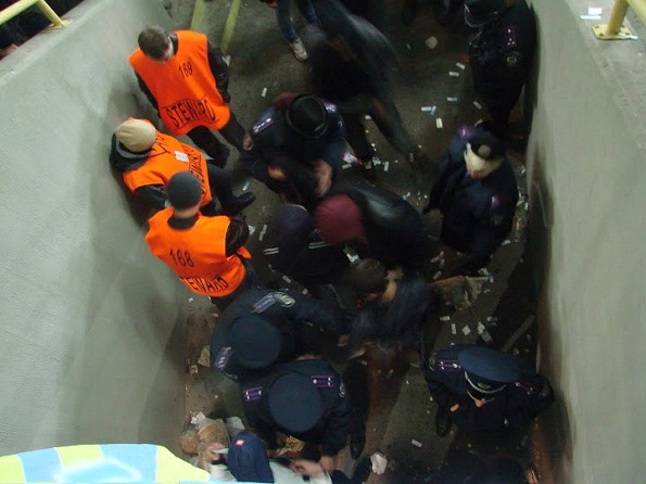 Пронести что-то на стадион было практически невозможно – одного фаната обыскивало около четырех сотрудников «Беркута».