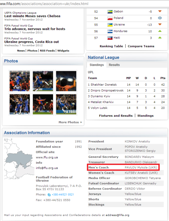 Интересная информация появилась на сайте ФИФА. В разделе о сборной Украины значится, что главным тренером национальной команды является Николай Павлов.