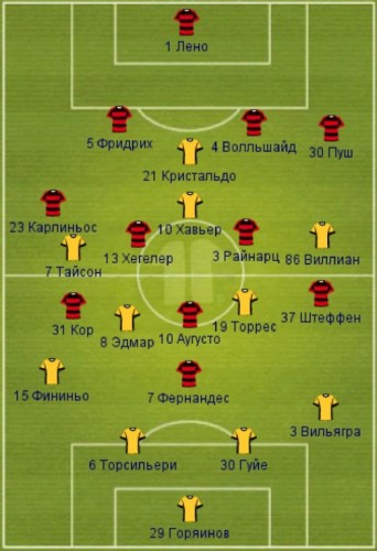 Звезда нападения «фармацевтов» Штефан Кисслинг появился на поле лишь на 15 минут, а несколько других игроков, которые в значительной мере определяют игру команды в атаке – Кастро, Шюррле, Карвахал, Беллараби – и вовсе не появились на поле. Впрочем, оборона «Байера» тоже была заметно ослаблена: №23 Карлиньос и №30 Пуш – молодые игроки, и появлявшиеся на поле лишь в играх Лиги Европы. Видимо определение этих дебютантов на фланговые противостояния с Тайсоном и Фининьо - и было тем самым экспериментом, который обещал накануне игры Сами Хююпя. И хотя этот эксперимент, изначально имел мало шансов на успех, выглядели новички (особенно Карлиньос) весьма активно.