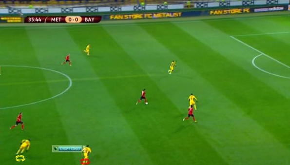 Одна из немногих быстрых атак «Металлиста» в первом тайме. Но и тут «Байер» выглядит весьма надежно. И хотя Виллану (с мячом) дадут выполнить передачу, оборона «Байера» выглядит уверенно, она успевает за нападающими «Металлиста», все зоны перекрыты.
