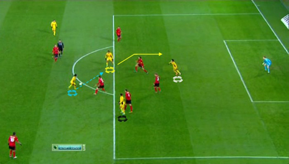 Момент, предшествующий удару Фернандеса. Хотя мяч в единоборстве потерял Хавьер (желтый), Фининьо (красный) не спешит подстраховать товарищей в обороне.