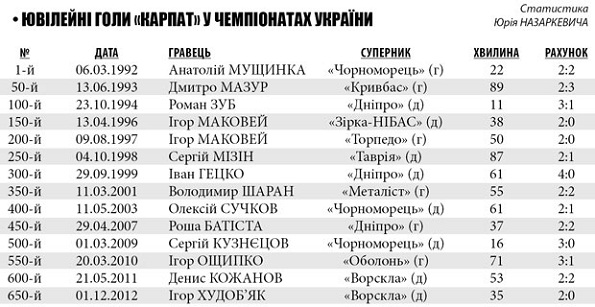 А вже у суботу 16-ий номер «зелено-білих», у своєму 243-му матчі, забив 30-ий гол за «Карпати» (вперше він відзначився в серпні 2005-го у воротах сумського «Спартака») і 650-ий м’яч команди у вищій лізі українського футболу. Загалом ці голи розподілилися між 107 гравцями «зелено-білих» та 4-ма «самострільниками» команд-суперниць. 50 голів було забито з пенальті, 95 – стараннями 22-х легіонерів. Рекордсмен клубу за історію – Андрій Покладок з 54 м’ячами. Найбільше забивали за сезон Іван Гецко і Олександр Паляниця – по 16 голів (1998/99).