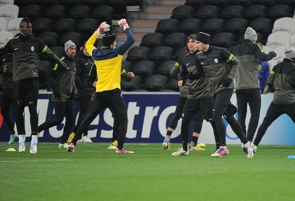 С самого начала туринцы компактно расположились на северной половине поля и приступили к разминочной и беговой работе, а затем перешли к розыгрышу «тарелочек», сопровождая весь этот процесс громкими криками. Вратари, которых в Донецк в составе итальянской делегации прибыло трое, занимались отдельно. Во главе с Джанлуиджи Буффоном голкиперы поочередно отражали удары по воротам в исполнении друг друга.