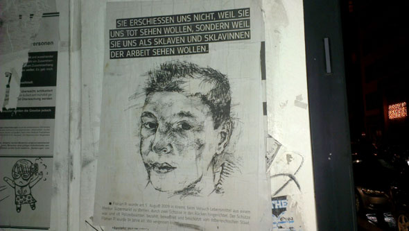 Флориан П. был казнен двумя выстрелами в спину 5-го августа 2009-го года в городе Кремс-на-Дунае при попытке кражи продуктов питания из супермаркета. Стрелком был полицейский, который служит стражем правопорядка и поныне. Ему платит, его вооружает и защищает австрийское государство. Флориану П. было 14 лет. Мы не забудем!»