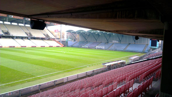 Фан-шоп «Рапида», расположенный по соседству, чуть разукрашивает эту серую громаду своими радостными зелено-белыми цветами. В ассортименте магазина вы найдете множество наименований – большой плюс менеджменту «Рапида»! – от банальных чашек и магнитов до внушительного вида наушников. Шарфики, посвященные противостоянию «Рапида» с «Металлистом», уже заняли свое место в ряду товаров.