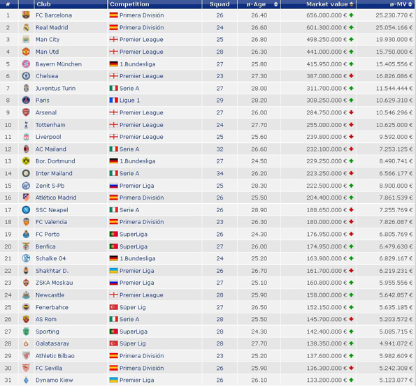 Популярное немецкое издание Тransfermarkt.de публикует рейтинг самых дорогих клубов мира, первое место среди которых прогнозируемо занимает «Барселона», общая стоимость игроков которой составила 656 миллионов евро (26 членов команды, в среднем каждый из которых стоит более 25 миллионов). На втором месте с 24-мя игроками в команде идет мадридский «Реал» - 601 миллион евро. А тройку замыкает «Манчестер Сити» - 25 игроков, стоимостью 498 миллионов.