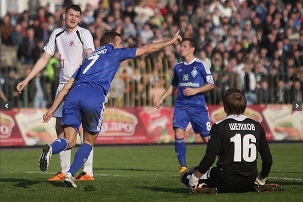 Свой последний сезон 2011-12 Андрей вытащил, что называется на жилах, безумно желая сыграть на домашнем Евро. И это у него получилось! Об этом немного позже, а пока вернемся в весну 2012-го, ставшей для Шевы прощальной в футболке родного «Динамо». «Бело-синие» по разным причинам буквально приговоренные к поражению в Донецке от «Шахтера» сохраняли все же шансы на завоевание чемпионского звания. Как мог вносил надежду на это в динамовские сердца и Шевченко. Уже в следующей домашней игре он отправил мяч в сетку ворот полтавской «Ворсклы» (14.04.12), а в выездной встрече против луцкой «Волыни» и вовсе забил единственный победный мяч киевлян (22.04.12, на фото), ставший для него последним в динамовской футболке.