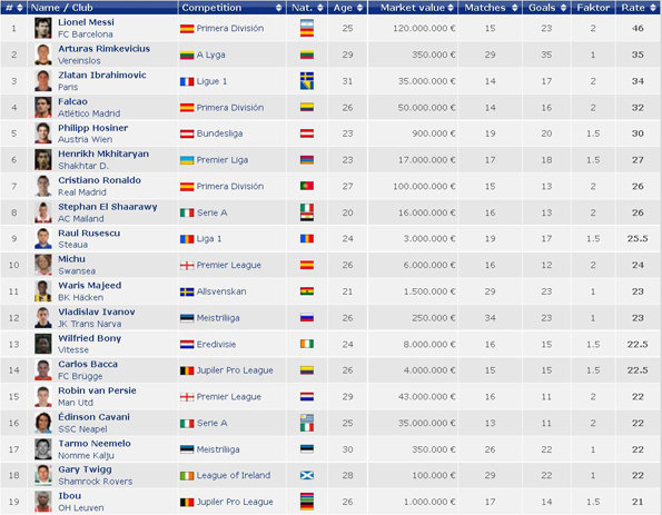 В зачете у Мхитаряна, который провел в чемпионате 17 матчей, 27 баллов (напомним, что у каждого чемпионата существует свой коэффициент, который умножается на количество забитых голов. В Украине этот коэффициент составляет 1.5, а в Испании, например, 2). Вслед за Мхитаряном идет Криштиану Роналду (15 матчей, 13 голов) с 26-ю баллами.