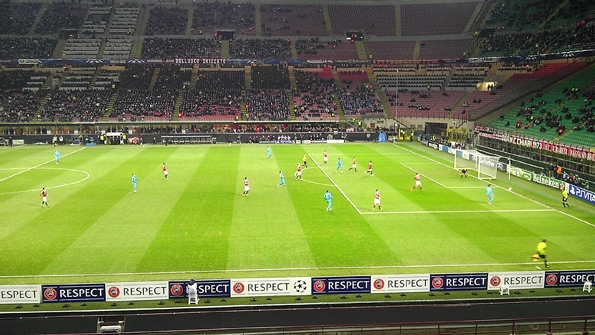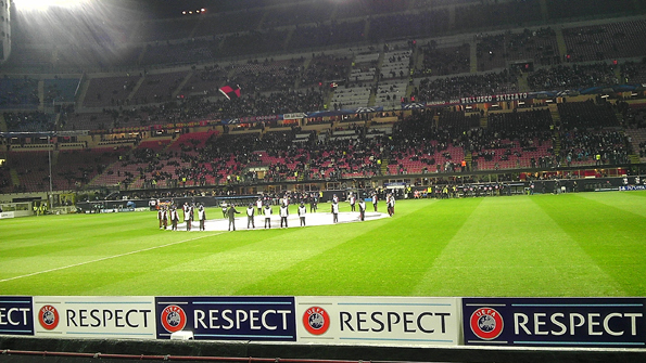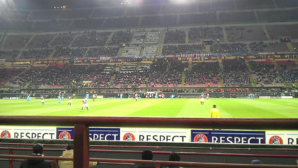 Чаша «Сан Сиро» чем-то напоминает донецкую «Донбасс Арену». Визитная карточка итальянской арены – четыре здоровенных колоны. Приятно удивило, что от ближайшей станции метро к стадиону курсировали бесплатные автобусы. Пройти через турникеты можно было, только предварительно отсканировав штрихкод на билете. Технология действительно работает, правда, пока что Киев - исключение в подтверждение правила. Местные стюарды через один понимают английский, однако неподдельное желание помочь помогло найти свои места. Кстати, билеты у нас были именные, а несколько раз даже попросили предъявить паспорт для сверки данных.
