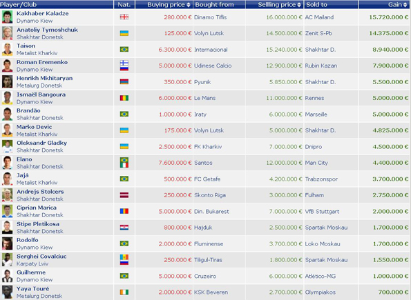 Первое место среди 75 исполнителей занимает Каха Каладзе из киевского «Динамо». В 1998 году этот защитник обошелся киевлянам в 280 тысяч евро, а спустя 3 года он переезжал в «Милан» уже за 16 миллионов евро. Таким образом клуб заработал на грузинском футболисте около 15 миллионов 720 тысяч евро.