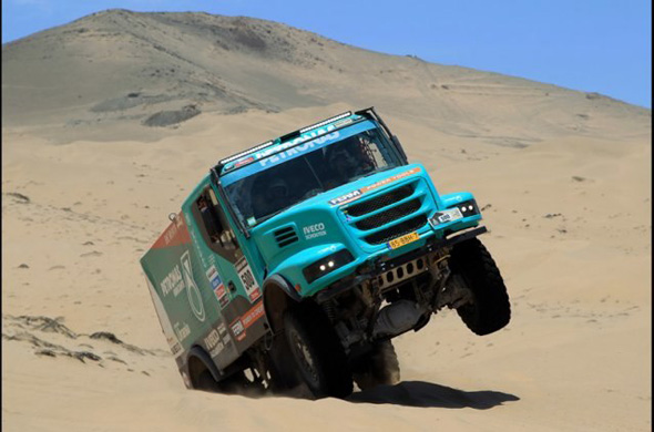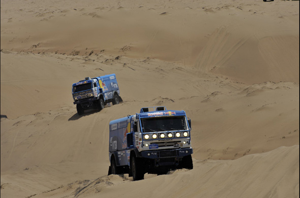 Среди грузовиков борьбу продолжало 62 машины. Ну а реальную борьбу впереди – все те же главные герои. После вчерашнего незадавшегося участка «победителем» (то есть в данном контексте – получившим право стартовать сегодня впереди «одноклассников») был назначен Де Рой. Следом стартовал Лопрайс… Но уже к первой контрольной точке Лопрайс обошел голландца – тот вынужден был останавливаться вскоре после старта.