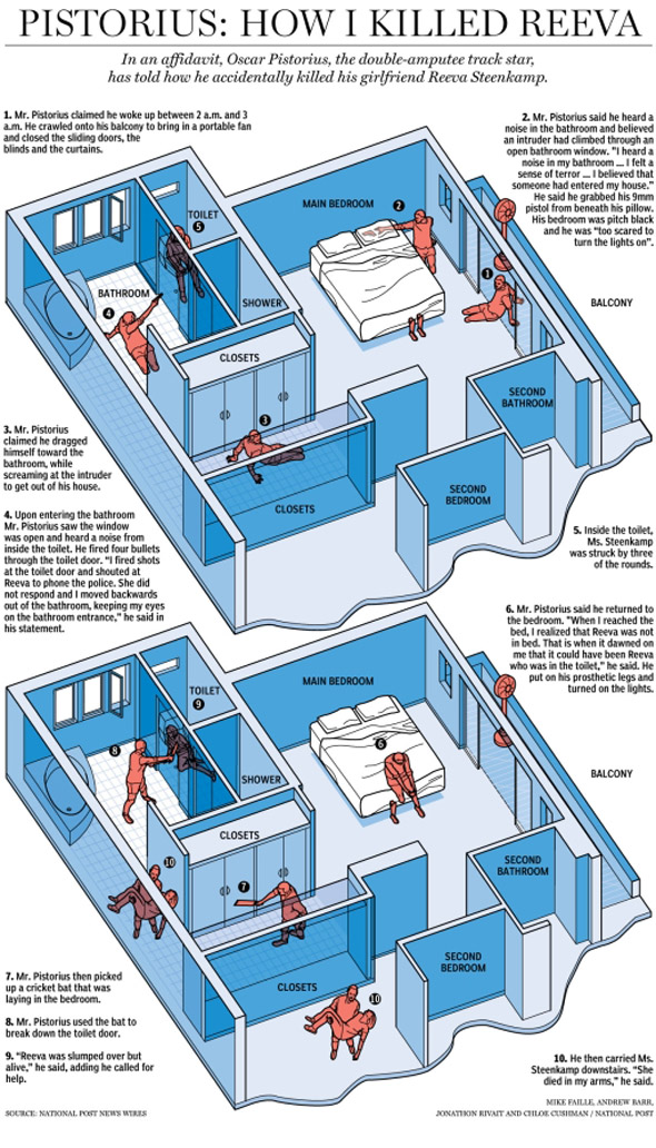 Издание National Post восстановило ход событий в доме Оскара Писториуса по версии самого бегуна, обвиняемого в убийстве своей девушки Ревы Стенкамп. График нарисован в соответствии с показаниями самого Писториуса в суде, чтобы представить его версию событий.