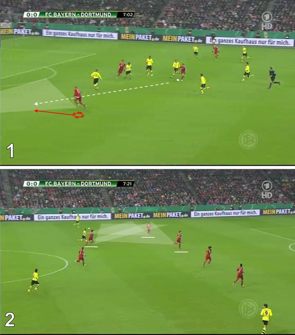 Сравнительная картина атак «Баварии» и «Боруссии» на первых минутах: в обоих случаях задействованы первоначальные акценты на левый фланг.